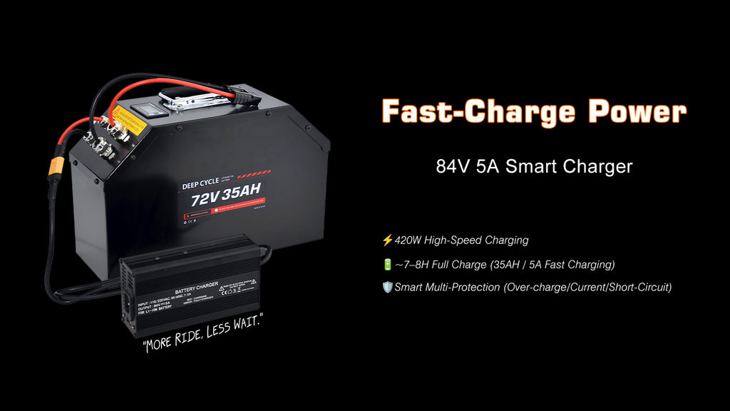 - ⚡ Fast Charging : Experience reduced downtime with our included 84V 5A fast charger. This smart charging system features comprehensive safety protections including short circuit prevention, overcharge protection, and automatic cutoff for safe, efficient charging cycles.