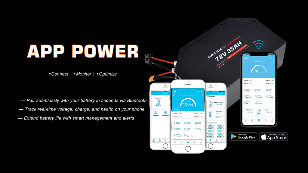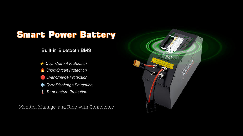 - 📱 Smart Bluetooth BMS : Stay in complete control with our intelligent Battery Management System featuring Bluetooth connectivity. Monitor voltage, temperature, and capacity through our mobile app, with configurable current settings (60A/80A/100A) to match your motor requirements perfectly.
