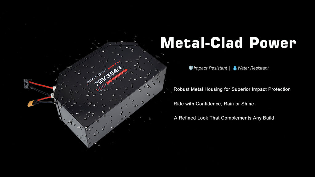 Our 72V 35Ah battery features a metal enclosure for physical protection against impacts and damage. The solid housing shields the battery pack while maintaining structural integrity.