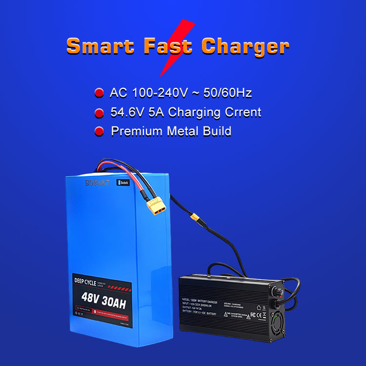 - Fast Charging Support : Specifically designed for 48V 30Ah batteries, our 54.6V 5A smart quick charger enables 6-7 hour rapid charging cycles - 50% faster than conventional lithium battery chargers. Features built-in safety protection including overcharge prevention, short circuit protection, and automatic shutoff when fully charged, significantly improving charging efficiency and user experience.