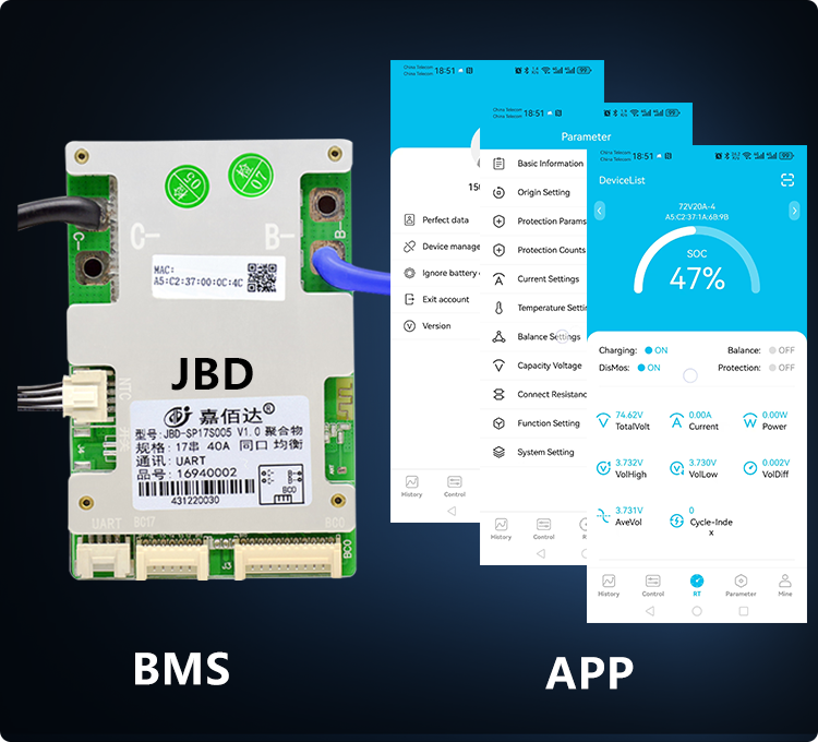 Bluetooth communication, active voltage balancing. Overcharge, over discharge, short circuit and overload protection.