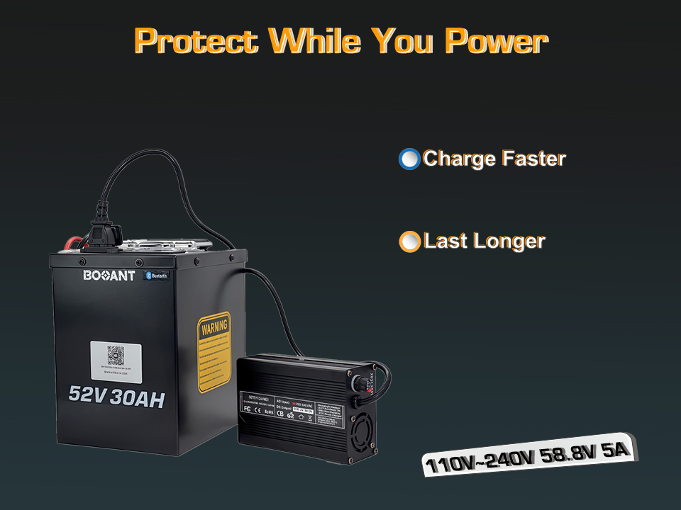 This smart fast charger provides a strong 5A charging current, ensuring that your 52V 30Ah battery is immediately ready for use.
